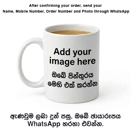 අවශ්ය පරිදි සකස් කරගන්න (Personalize): ඔබ නම, ඇණවුම් කළ අංකය (Order Number), ඔබේ දුරකථන අංකය සහ මග් එකේ මුද්රණය කිරීමට අවශ්ය පින්තූරය හෝ වචන අපගේ WhatsApp (0742909600) අංකයට එවන්න.